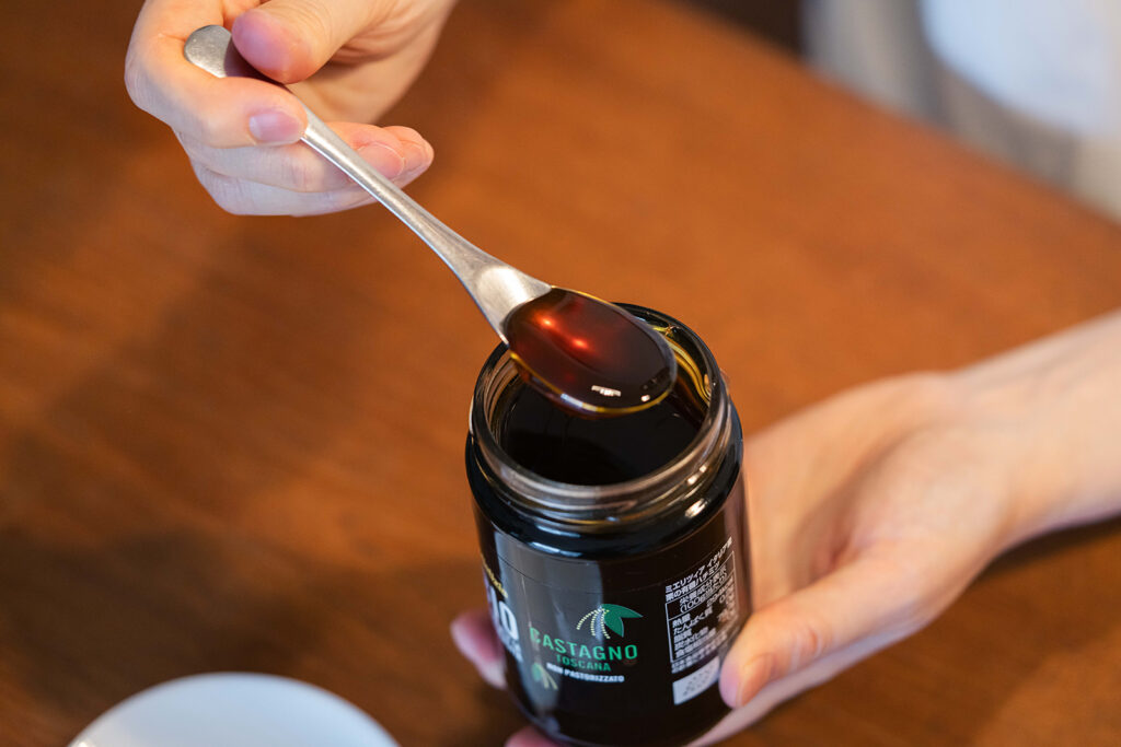 「パルミジャーノ レッジャーノをブロックのまま食べる場合、クリームタイプのはちみつを組み合わせるのがおすすめです。クリームタイプのはちみつは攪拌してあるのでとろみがあり、チーズに乗せた際に液ダレせず、食べやすいと思います。クリームタイプにもいろいろありますが、アーモンドのハチミツはチーズに乗せると、まろやかなコクが感じられると思います。一方、ラベンダーのはちみつでは、ハーブの香りが楽しめます。これらのトロっとしたはちみつをパルミジャーノ レッジャーノにかけていただくと、口に入れた後にチーズの旨味と一緒に甘みが追ってくるように、はちみつが口の中でゆっくり広がるので、チーズの旨味と相乗効果で楽しめると思います。白ワインやロゼのおつまみにもぴったりだと思います」