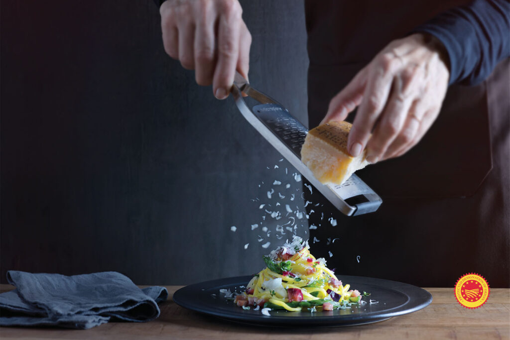 「イタリアの家庭では、パルミジャーノ レッジャーノはパスタやリゾットといった定番以外にも幅広く使われます。カルパッチョに削ってのせたり、サラダに加えたり、野菜スープに溶かし込んで味の奥行きとコクを出すこともあります」
