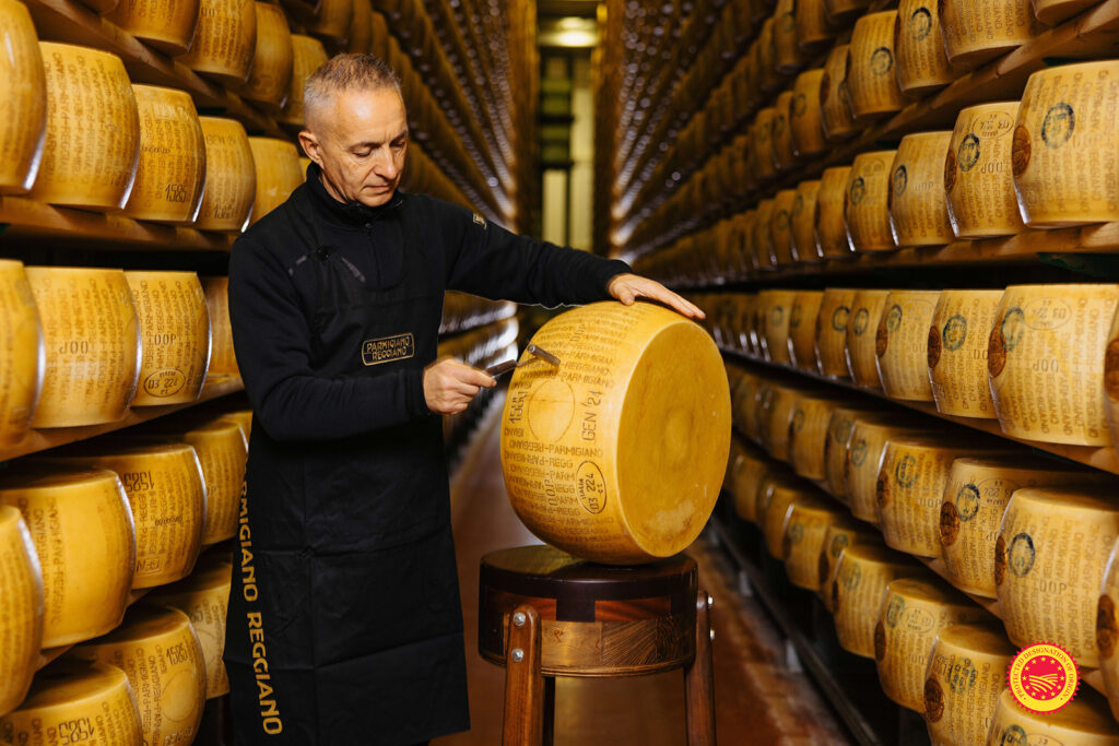「すべてのパルミジャーノ レッジャーノは最低12か月熟成され、厳格な品質検査を通過したものだけがコンソーシアムの刻印を押されます。本物のチーズを見分ける最もわかりやすい方法は、外皮全体に刻まれた点字状の『Parmigiano Reggiano』の文字です。これこそが本物の証です。時間とともにチーズは自然に変化していきます。12〜18か月では繊細な味わい、24〜36か月ではナッツのようなコクと旨味、40か月を超えると力強く濃厚になります」