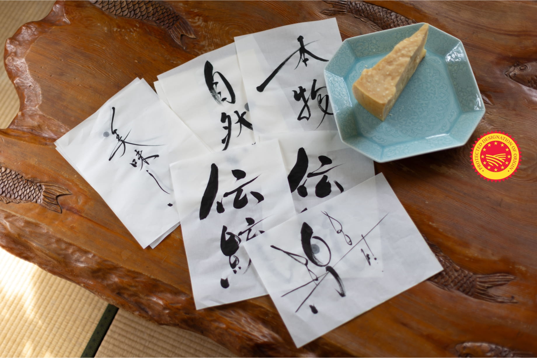 「パルミジャーノ レッジャーノが約1000年もの歴史があり、ほぼ同じ製法で作られ続けたことに驚きました。長い年月を経るなかで、人々の生活様式も変わっていったと思います。それなのに人々が変わらず美味しいと感じていること。時を超えて人々に感動をもたらしていることに非常に興味がありますし、なにか書道に通じるものを感じます。書だけでなくアートも同じだと思いますが、その時々の流行の表面だけを捉えて真似しても、一時的には人気が出るかもしれませんが長続きはしません。パルミジャーノ レッジャーノが長年親しまれてきたのは、人々ともっと深い繋がりを築いてきたからだと思います。私自身も、書の世界に連綿と受け継がれてきた伝統を大切にしながら、今の時代に生きている自分だからこそできる表現を追求し、皆さまにお届けしていけたらと思います」
