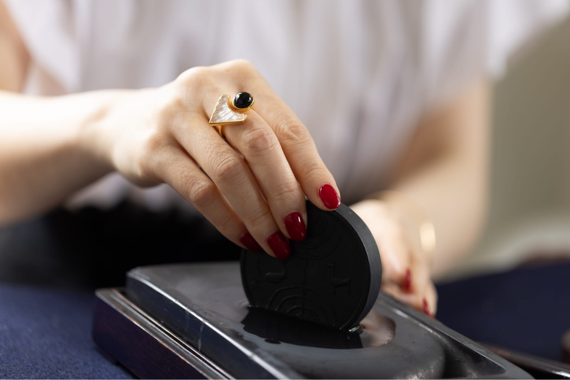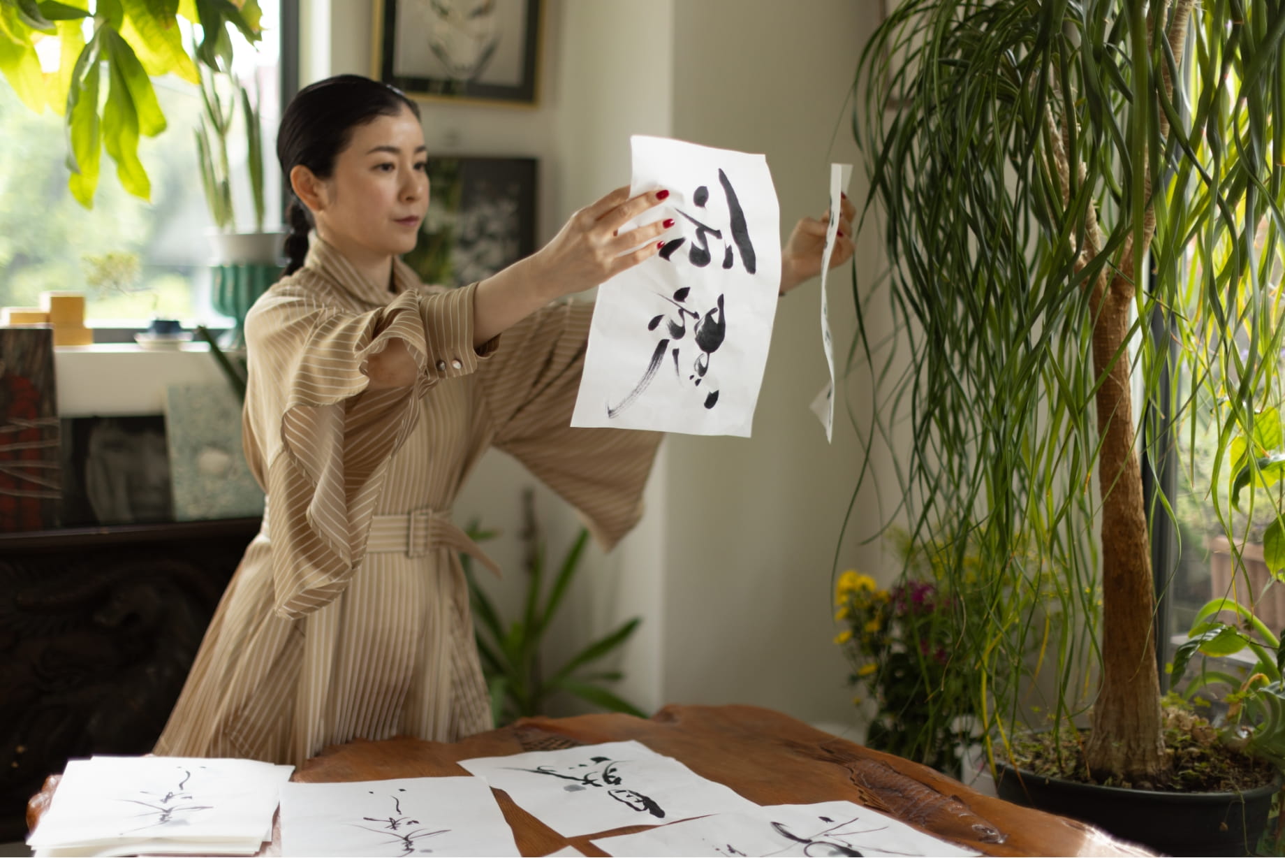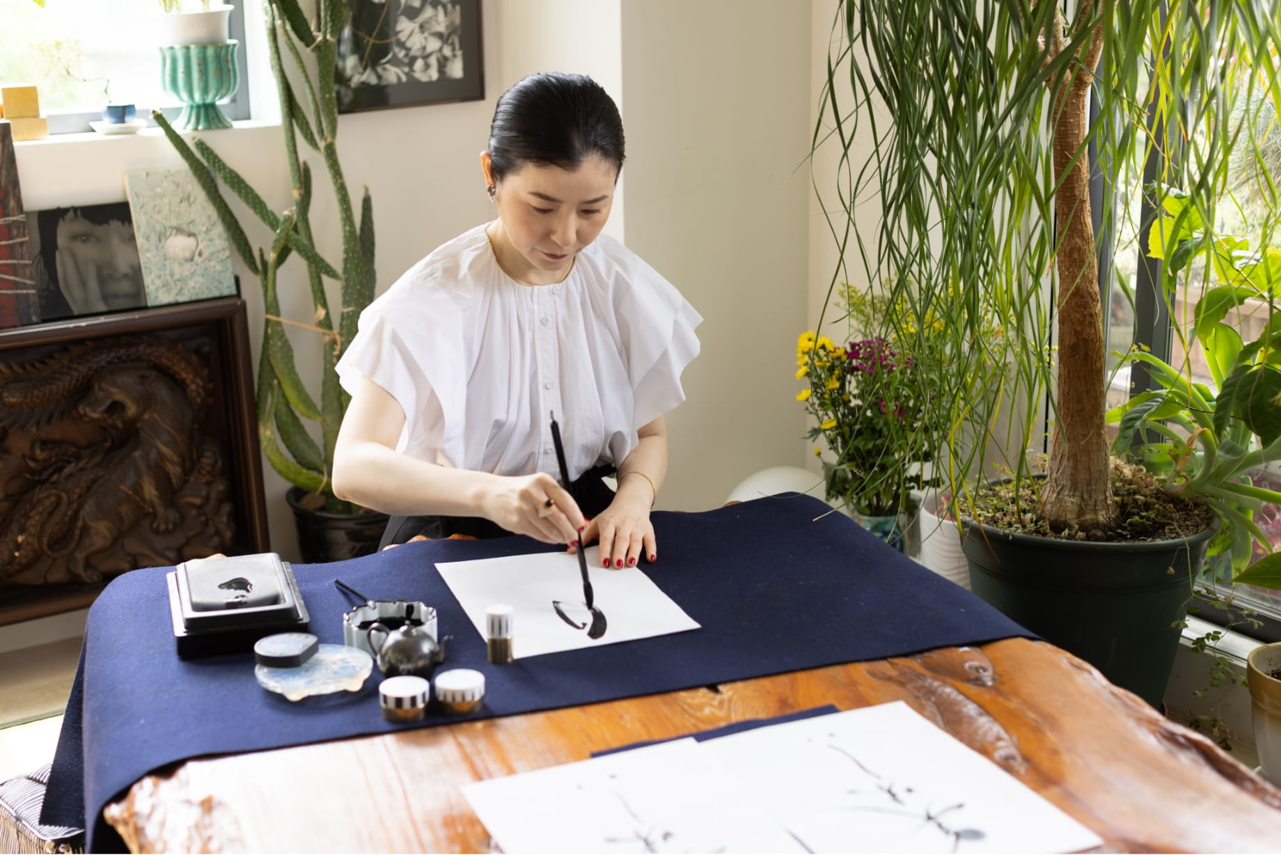 「書は人の心を映し出すものだと思います。大切にしているのは、なるべくニュートラルに、そのときに自分が感じたものをそのまま表現できる状態に保つということです。もちろん人間なので喜怒哀楽はありますし、いいことばかりではありません。日々やらなければならないこともあります。でもそうした雑念に惑わされないように、常に自分の心を映し出せる状態を保てるように心がけています。以前、個展を開催する前に思うように作品を作れず、葛藤した時期がありました。苦しみはありましたが、その先にある喜びを想像し、作品づくりと向き合いました。そうしたら、会場にお越しいただいた方から、“この作品からエネルギーをいただくので、ぜひ我が家にお迎えしたい!”というお言葉をいただきました。作品には自分の想いが投影されているからこそ、ご縁のある方の元に嫁がせていただくのだな、ということを改めて感じました」