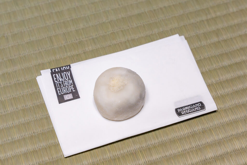 「得牛」では、通常より卵白の量を抑えることで、チーズと餅がなめらかに溶け合い、口に含むとまずほのかな塩味が立ち、やがて旨みが広がる味わいに仕上げられている。さらに、パルミジャーノ レッジャーノが練り込まれているだけでなく、表面にもかけられており、さまざまな食し方ができるパルミジャーノ レッジャーノの特性を生かした菓子に仕上げられていた。