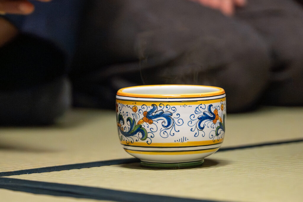 「この茶碗は利茶土ミルグリムの片身替り、釉薬を分けて陰陽を表しているように見えます。そして三碗目はマヨリカ焼きの“リッコ・デルータ”という文様で、2006年にローマで開かれた裏千家の集いの記念品として作られたものです。今回はイタリアとのご縁ですから、水指と茶器には祖母がヴェネツィアで求めたものを選びました」