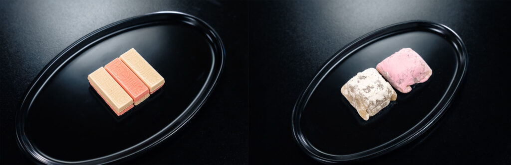 (左)長生殿(ちょうせいでん):加賀藩御用達菓子司・森八を代表する、日本三名菓のひとつ。落雁ならではのやさしい口どけと、紅花で染めた淡い紅白が、四百年近くにわたり祝いの席を彩ってきた。静かに広がる甘味に、歴史の重みを感じる一品。(右)千歳:紅白の彩りが印象的な、森八の伝統的な祝い菓子。長寿や繁栄への願いを込め、節目の日に選ばれてきた。素朴で澄んだ甘味は、世代を超えて寄り添う味わい。
