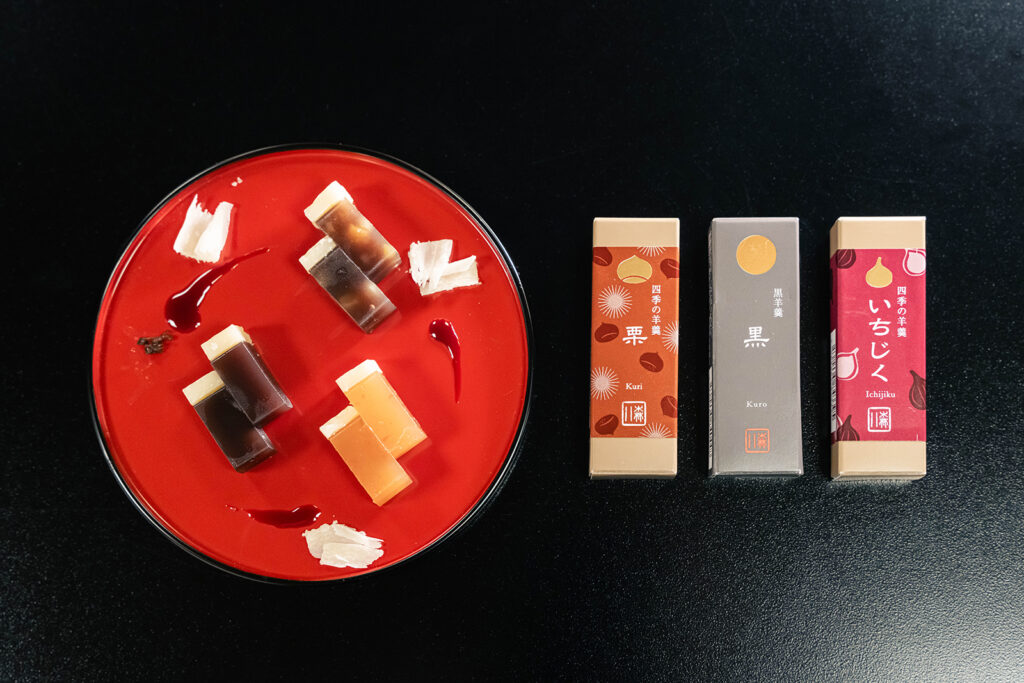 「盛り合わせたのは『黒羊羹』、刻んだ栗が入った『栗羊羹』、そして『イチジクの羊羹』です。白州や山崎をロックで嗜みながら、フィンガーサイズで少しずつつまむイメージです。食後のひとときを楽しむシーンにぴったりだと思います」