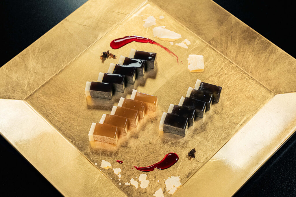 「二つ目は、お酒とのペアリングを楽しむ一品です。チーズとドライフルーツの相性の良さから着想を得て、パルミジャーノ レッジャーノと羊羹を組み合わせました。羊羹に含まれる適度な水分がドライフルーツに近い感覚で、チーズとの粋な組み合わせを楽しめます」