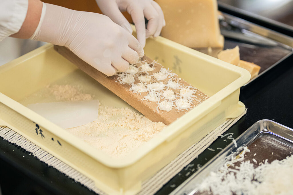 400年に渡り受け継がれてきた森八の和菓子。その歩みは、パルミジャーノ レッジャーノとの間に共通点を見ることができる。パルミジャーノ レッジャーノは、北イタリアの限られた地域で約900年にわたり作り続けられてきた、イタリアを代表するチーズ。主にその土地の飼料で育てられた乳牛のミルクと塩、レンネットで作られる天然の恵で、保存料や添加物は一切使用していない。チーズ職人は酪農家と連携しながら上質なチーズを作り上げ、その製法や熟成方法はDOP(原産地呼称保護制度)により厳しく定められている。