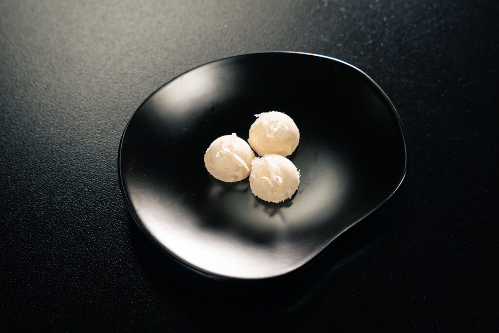 「最後の一品は、少し手間がかかりますが、参考までにご紹介します。落雁に使われる和三盆糖と、パルミジャーノ レッジャーノの香りの組み合わせに可能性を感じ、考案しました。和三盆糖は、盆の上で繰り返し研いで作る日本独自の製法による高級砂糖で、森八では特別に精製してもらった香り高いものを使用しています」